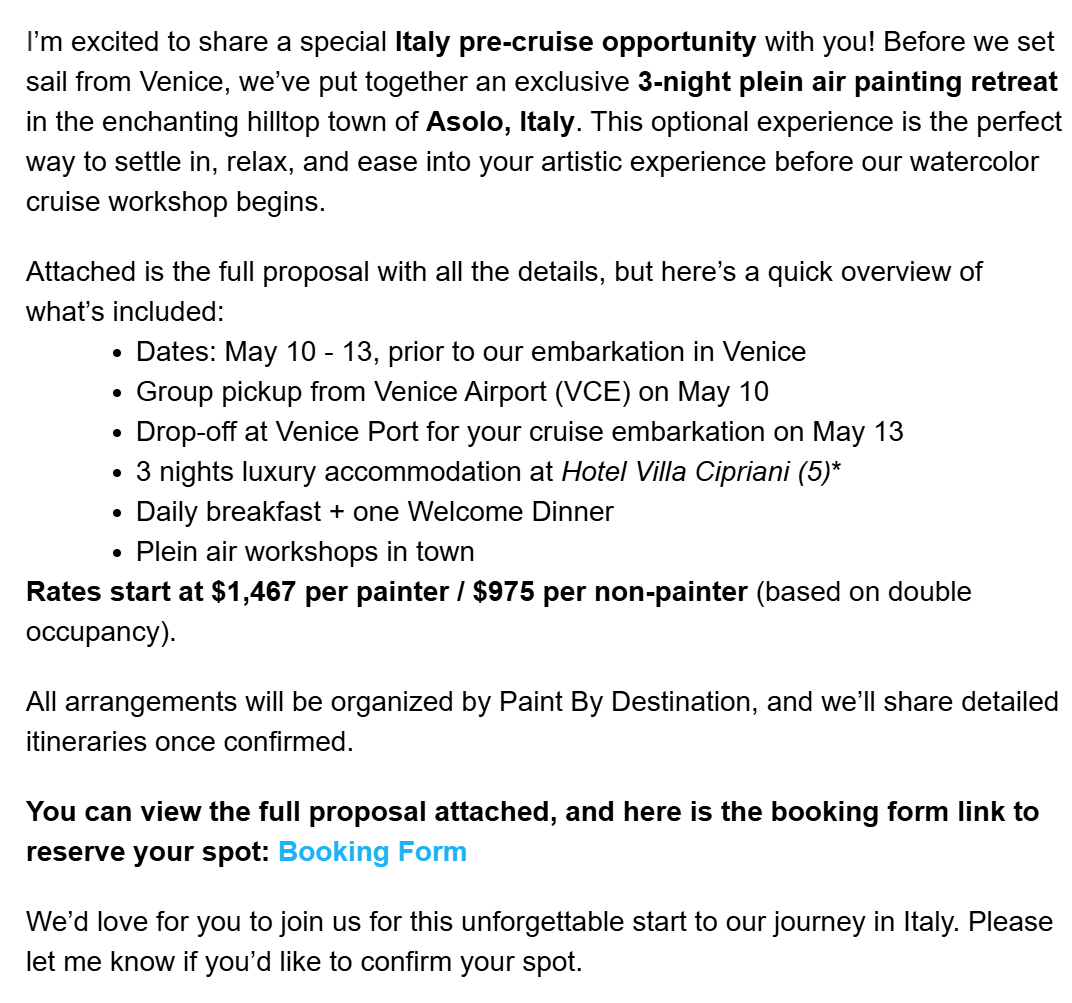 5 excursions (one in each full-day port) that the art instructor hand-selected